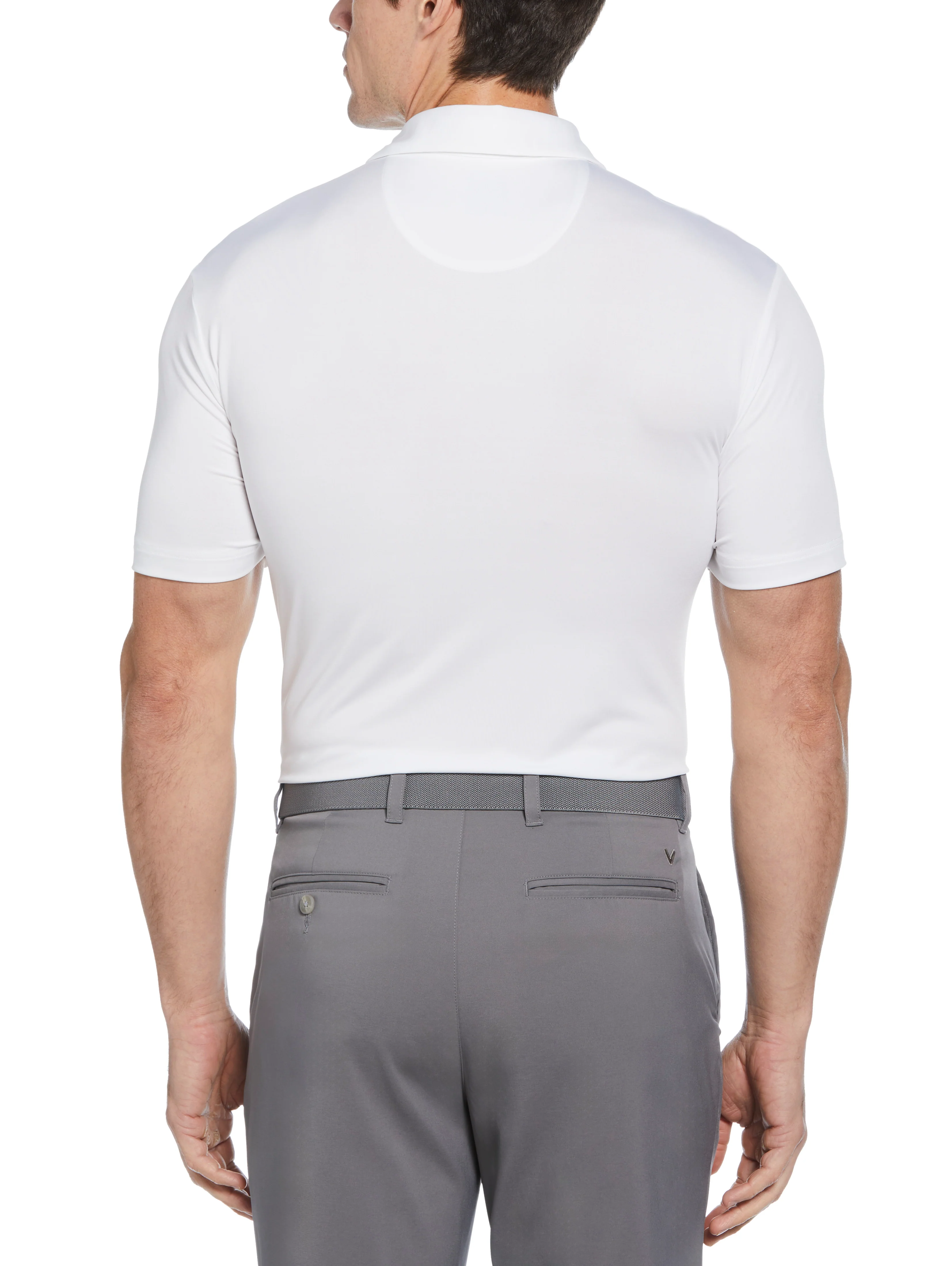 On and off the course, this Callaway men's golf shirt offers smart style and all-around comfort. Crafted from jersey fabric, this golf polo also includes built-in sun protection and moisture-wicking technology to help you feel cool and comfortable during your game. This golf polo shirt also features a blocked print on the chest for a classic sporty look that suits any course or casual event.